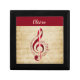 A beautiful, personalized music keepsake gift box featuring a festive red treble clef with music notes in a spiral staff, on top of a vintage beige piano sheet music background. Can be used at home, in the office, or for a music teacher at school on their desk. The perfect size for holding jewelry, accessories, desk items, or used as a gift box. A great gift for band, orchestra, or classroom music teachers, music students, or anyone who enjoys music!