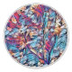 An abstract art design of a small woodland tree in blues, reds and brown colours.