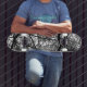 A skateboard with a high contrast photo of a tree in winter. Creating a dramatic natural design.