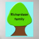 This customizable family tree poster has a green tree on it. The text says Richardson family but is customizable to allow you to enter your own family name. The text is black and the font gives it a charcoal look. The background color is sky blue and there is a black border around the poster. The design is available on several different sizes of poster, the largest of which is shown here.