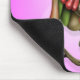 A green tree frog is perched on a branch in front of a light pink background. The frog is looking off to the right with one of it’s bright red eyes visible. The little guy’s red hands and feet are wrapped around a slim brown branch that begins at the bottom of the design and moves up and to the left. This bright and colorful design makes a cute and playful mousepad.