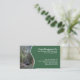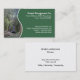 A business card template for forestry and timber companies with a photo of a blue harvester felling a conifer. On the front are the company name, address and contact details on a dark green panel separated from the photograph by a white wavy line. On the reverse is space for an employee's name and position, and any other information. This is on the white colored card stock, with a customizable background colour on the reverse.