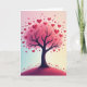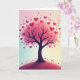 This design shows a dark, twisting tree with bare branches standing on a rolling magenta hill. Instead of leaves, the top of the tree is filled with soft pink clouds, and lots of red and pink hearts float up into the sky 💘. Some hearts look lighter and some look darker, which makes it feel like they’re drifting away on a gentle breeze. The sky fades from light pink at the top to a warm yellow-orange on one side and a calm light blue on the other, giving the whole scene a quiet, romantic feel ❤️. On the ground, small heart-shaped plants are scattered around like little signs of love growing nearby. There isn’t any text shown on the card, so the art is the main message. It’s a sweet pick for someone you care about, and a simple way to share Valentine’s Day 😘.