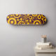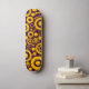 An attractive abstract design made up of circles, some solid, some double, some spoked like wheels. All the circles are connected with a network of lines, like cords, strings or wires or maybe stems and tendrils. Creating a composition that might be the inner workings of some sort of mechanism, some kind of diagram, maybe a microcosmic map of the universe. The colors are amber on a dark purple background. Made from a vector original and output at 300 dpi to ensure the best print quality.