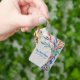 This decorative keychain features a rainbow colored mosaic tree of life on a pale gray background.