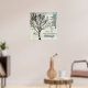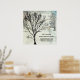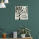 Christian tree poster with scripture from Psalm 1:1-3. 'Blessed is the man...he is like a tree planted by streams of water.' Inspirational verse about the prosperity of a man of belief. Grunge style, black tree branches over a graphic background with printed black text on a square poster.