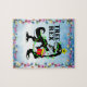puzzle with a dinosaur wrapped in Christmas Lights with a snowy white/ blue background