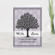 This greeting card features a tall black silhouette of a leafy tree filling the upper half, its branching canopy spreading like an embrace that suggests a steady bond ❤️. Behind it sits a soft lavender‑gray background with a faint, repeating ornamental pattern in lighter gray that adds gentle depth. Across the middle, a bright white horizontal banner stretches from side to side, edged with small dotted lines that feel like careful stitching. Centered on the banner, the words “With Love” appear in flowing black cursive lettering, giving the message a tender, close-to-the-heart tone. Just below, a shorter line of dedication is set in a simple, neat black print style, aligned to read clearly and calmly. A strong double black border frames the whole piece, keeping the layout tidy and balanced. The contrast between the dark tree and the muted background creates a quiet, romantic mood, like two people standing close under shared shade 🌼. The tree’s round leaves cluster densely near the top, while the dotted banner lines run straight across the center against the patterned field.