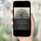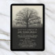 Memorial service invitation in muted colors with the silhouette of a tree against the sky, mist covering the ground.