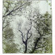 A view seen by gazing up towards high above tree branches and leaves. Olive greens and dark brown black in the trees against a soft seafoam green backdrop of sky. Bring a little bit of nature indoors.