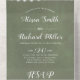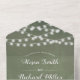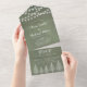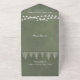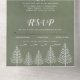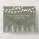 Trees and string lights on limed ash green all in one wedding invitation. It features white trees and string lights on green color. The names are in script typography and the tear off RSVP card can be detached.