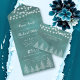 Trees and string lights on stained teal blue winter all in one wedding invitation. It features white trees and string lights on stained teal blue background. The names are in script typography and the tear off RSVP card can be detached.