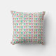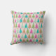 A pretty and festive holiday throw pillow with Christmas trees of various bright colors on front, strings of colored lights on the back!