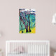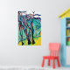 This modern abstract landscape features a beautiful scene with several trees standing in the mountain foothills with several mountains in the background. This colorful print features shades of blue, green, teal, yellow, brown, black along with a touch of red tones. This unframed print is available in various sizes to fit standard frames.