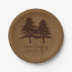Trees on wood brown woodland wedding paper plate featuring two conifer trees on wood grain and text in brown. This modern and stylish wedding design is a completely customizable template and is part of a wedding set perfect for a rustic woodland forest wedding, bridal shower, reception, engagement, or anniversary party. Note that there is not real wood just a PRINTED image.