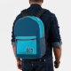 Trendy and minimalist vivid cyan & blue backpack with two letter monogram and name written in a modern font.