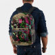 This vibrant and unique backpack is a perfect blend of style and functionality. It features a mix of green, pink, purple, and black colors, creating an eye-catching pattern that stands out. The pattern is further accentuated with yellow dots and lines, adding a touch of whimsy to the overall design. The fully customizable name is elegantly written in yellow cursive letters on the top, adding a personal touch to the design. This colorful and personalized design makes the backpack not just a utility item, but a fashion statement.