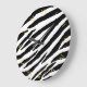 A clock with a modern and trendy black and white zebra animal pattern and gold colored roman numerals.