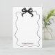 This elegant personalized note card design features a flowing black ribbon squiggle border that adds a touch of whimsical sophistication, topped with a beautifully tied coquette bow. The center offers ample space for handwritten messages, while the name at the bottom is elegantly displayed in an elegant script for a refined personal touch. The back of the card is solid black, providing a bold contrast and luxurious finish. Ideal for stylish correspondence, thank you notes, or everyday messages, this design combines playful curves with minimalist monochrome elegance for a versatile and polished stationery option.
