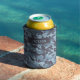 Stylish can cooler featuring a modern and trendy military camouflage pattern in shades of blue; the wording on top is customizable with your name or text of your choice in light blue lettering.