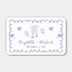 Trendy retro-inspired wedding matches featuring a blue wavy frame with coquette bows, whimsical hand drawn illustrations of hearts and champagne glasses, and the names of the bride and groom showcased in a fun, playful blue script.