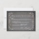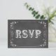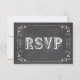 This design features a faux chalkboard background with fancy scrolls and hearts. Unique typography that reads: "R S V P". The reverse side of this trendy response card has the same scroll work design with custom text fields for your guests to fill in their response information. The chalkboard on this side is lightened up so that you can easily read your guest's response if they write in black ink. We have matching "eat, drink and be married" stamps, invitations and Thank You cards for this design!