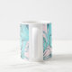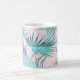 A fresh and trendy tropical palm fronds pattern in cool icy turquoise blue over a blush pink background adds the allure of the islands to this custom coffee mug. A matching double frame surrounds your monogram in the center of the design on each side of the mug. Personalize with your desired monogram or other text.