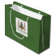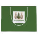 Minimalist watercolor christmas tree gift bag with playful leopard pattern in earthy green and gold. Personalize with your custom name for a stylish Christmas gift presentation.