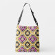 The design features a detailed abstract geometric mosaic tile pattern that is both trendy and timeless. The Bohemian style is perfect for those who love maximalist or eclectic fashion. The rich mustard yellow, striking hot pink, and contrasting black and white provide a high-energy aesthetic that is ideal for spring, summer, and festival season.