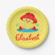 A cute yellow and white polka dot background, there is a cute duck playing in a puddle of water. There is a template for inserting a name at the bottom. Order your paper plates today!