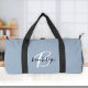 This personalized duffel bag features a monogram and first name in modern black and white script on a stylish dusty blue background.