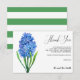 Trendy rustic style Wedding Details Card with a Blue Hydrangea flower and white and green striped pattern on the reverse of the card.