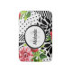 Capture the attention of all your friends with this trendy black and white geometric pattern with diagonal stripes, polka dots, and a chic red floral pattern. Personalize this design that is both modern and girly by adding your name and monogrammed initial to the circle badge in the center.