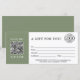 Modern minimalist business gift certificate featuring QR code, logo and contact info in a clean Sage Green design. Combines both a gift certificate and a business card in one. Perfect for small business owners, salons, spas, boutiques, or corporate gifting. Personalize with your own text and company branding. A simple, professional way to offer gifts, promotions, or store credit. Elegant and custom-made to match your unique brand style. Great for holidays, birthdays, thank you gifts, or special events.