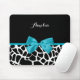 A chic black and white giraffe print mousepad with a trendy aqua blue ribbon tied into a girly bow. Personalize this cute animal print design by adding your name. Flat printed image, not actual bow.