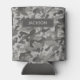 Stylish can cooler featuring a modern and trendy military camouflage pattern in shades of grey; the wording on top is customizable with your name or text of your choice in light grey lettering.