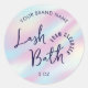 Trendy holographic design lash bath label with fully editable text and handwritten style font. Brand your lash shampoo bottles with this girly pink and blue gradient round stickers.