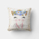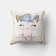 Trendy kitty princess monogram pillow. Pretty cat princess face in rose gold, blush pink and gold glitter, pink heart shaped nose and big black eye lashes, with a crown and blue floral arrangement, blush pink and golden tones. On the sides faux golden pink sparkles confetti. Easily customize and add your name and monogram to personalize the pillow.
