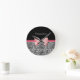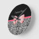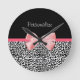 A trendy black and white leopard print clock with a cute pink ribbon bow wrapped like a present. Personalize by adding your name. Perfect present for a teen girly girl!