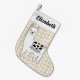 Christmas stocking featuring a cute black and white llama drawing over a white fir trees pattern. Personalized your name at the top.