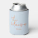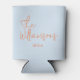 This trendy can cooler features a modern blue and orange design with elegant script lettering, making it a stylish choice for wedding favors or party celebrations.