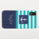 Modern nautical iPhone XR case with turquoise & navy blue striped pattern and customizable text.