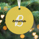 Trendy, stylish custom name and initial monogram style christmas tree ornament in modern minimalist script typography in off black and white on a simple fun mustard yellow background. The name and initial can easily be personalized with your own name or the name of a loved one for a perfect gift for a friend or loved one!