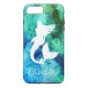 White mermaid silhouette and blue green inky swirls phone case featuring your name in white script.