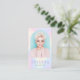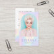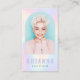 Modern, trendy business cards or personal profile cards with your photo inside an arch shaped frame on a pastel rainbow pattern background with your name in light purple below. On the back are customizable template fields for your contact information.