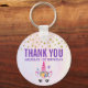 Birthday thank you keychain. Designed with a trendy pink unicorn. Adorned with a fancy floral headpiece. Whimsical butterflies flying around. Fake gold confetti sprinkled along the top. A pale purple and yellow watercolor background.