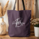 This elegant personalized tote bag features a monogram and first name in modern gray and white script on a trendy plum purple background.