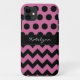 Trendy polka dot iPhone 5 case features black polka dots and chevron stripes on a pink background and a accent black ribbon stitch appearance border frame for you name, initial or other text. Show your personality with this trendy and fun iPhone 5 case. Makes a great gift for all occasions. Click the "Customize it!" button to change the background color, text color, text size, font style and more!