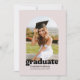Celebrate your graduate's milestone with our Trendy Retro Graduation Announcement in a chic color palette of blush and pink. This unique design captures the essence of nostalgia and modern style. The front showcases a stylish arch-shaped photo frame with a "graduate" inscription in retro typography, set against a blush backdrop. You can easily personalize it with your graduate's name and the school they are graduating from. The back of the announcement offers space for a second photo and a customizable blurb, where you can share your graduate's exciting future plans. Make this special moment unforgettable with a touch of vintage charm and contemporary flair.
