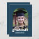 Celebrate your graduate's milestone with our Trendy Retro Graduation Announcement in a navy color palette This unique design captures the essence of nostalgia and modern style. The front showcases a stylish arch-shaped photo frame with a "graduate" inscription in retro typography, set against a blue backdrop. You can easily personalize it with your graduate's name and the school they are graduating from. The back of the announcement offers space for a second photo and a customizable blurb, where you can share your graduate's exciting future plans. Make this special moment unforgettable with a touch of vintage charm and contemporary flair.